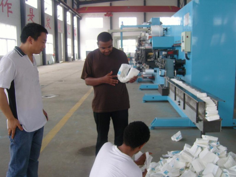 The function is complete, it can produce diaper of economic type and high quality, it can produce three types of products(L,M,S),if you change a few small parts, it is very easy to do so. The designing is advanced, the power and noise are lower.