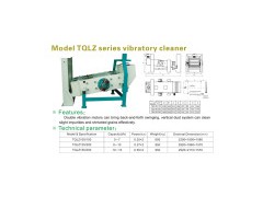 Model TQLZ Series Vibratory Cleaner Features: Double vibration motors can bring back-and-forth swinging. Vertical dust system can clean slight impurities and shriveled grains effectively. Technical Parameters: Model TQLZ100/50 TQLZ125/200 TQLZ150/200 Capacity(t/h) 5-7 6-10 10-15 Power(kw) 0.25*2 0.37*2 0.55*2 Weight(kg) 650 850 950 Dimension(cm) 225*150*156 292*186*157 292*211*157