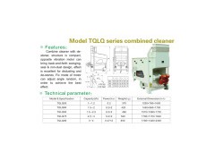Model TQLQ Series Combined Cleaner Features: Combine cleaner with de-stoner, structure is compact, opposite vibration motor can bring back-and-forth swinging, seal & non-dust design, effect is excellent for removing dust and de-stones. Fix mode of motor can adjust angle random in order to achieve the best effect. Technical Parameters: Model Capacity(t/h) Power(kw) Weight(kg) Dimension(cm) TQLQ50 1-1.2 0.2 370 125x76x160 TQLQ60 1.5-2 0.2x2 420 145x96x170 TQLQ65 1.5-2.5 0.2x2 480 157x106x173 TQLQ75 2.5-3 0.2x2 520 170x117x184 TQLQ90 3-4 0.37x2 650 170x132x230
