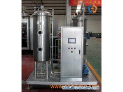 Beverage mixing machine is used for carbonation and proportion mixing of water, syrup, and CO2, in producing carbonated beverages, for examples, lemon, coca cola, fruit’s juice and so on. It is the main equipment in whole beverage production line. (Especially for middle and higher standard beverage production). Characteristics: 1) This machine adopts advanced technology from chemical industry– Static Mixing device (also named carbonization device). The contact surface of gas and liquid is full and the resistance is low, thus featuring high efficiency and low power consumption. Its structure is also concise and employing reliable multi-grade carbonation pump which is quiet and controlled by frequency convertor for start or run, thus ensuring the good performance of the complete equipment. 2) Precise mixing proportion and adjustable: To adjust the capacity or mixing proportion, no need to change any parts. 3) This machine adopts CO2 reflux for deoxidation, featuring economic use of CO2 and good effect of deoxidation. 4) This machine can conveniently adjust volume of carbonation in terms of the requirements of beverage’s carbonation. It can be done through suitable operation and adjustment to complete the procedure. 5) This machine has full automatic controlling system; it has advantages of concise structure, harmonious working action, continuous production, and high automatic performance. 6) This machine has cleaning procedure in original position and favorable structure. Convenient chemical disinfection or heating disinfection or cleaning with clean water can be carried out according to hygiene requirements of foods. 2Main Technical Parameters(1). Capacity 5000kg/h(2). Range of proportion (syrup to water) 1:3 – 1:10(3). Volume of Carbonation (CO2: H2O in volume) 〉2: 5(4). Mixing precision tolerance ≤2%(5). Cooling water temperature inlet 0-4℃(6). Cooling water pressure inlet 0.01-0.08MPa(7). Syrup temperature inlet 2-8℃(8). Syrup pressure inlet 0.01-0.08MPa(9). CO2 pressure inlet 0.7-0.8MPa(10). CO2 purity >99.9%(11). Pressure for pre-carbonation tank and syrup tank 0.05-0.09MPa(12). Pressure of the finished tank 0.2-0.5MPa(13). Total motor power 8.55kw(14). Overall dimension (long * wide *high) 2200*2200*2400mm(15). Total weight 1600kg