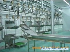 Sheep Slaughterhouse Sheep to be slaughtered are relaxed first by warm shower. Then hung up, and be sent to the automatic bloodletting line. After changing the rails, they are sent to the carcass processing line, and do pre-cutting, decorticator, breast-opening, organ removing, half-cutting etc. The red and white organs taken out will be processed by the sheep synchronous hygienic inspection line, and the two halves of the split sheep will be sent to discharge the acid in the acid-discharging cabinet through the manual track.