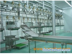 Goat to be slaughtered are relaxed first by warm shower. Then hung up, and be sent to the automatic bloodletting line. After changing the rails, they are sent to the carcass processing line, and do pre-cutting, decorticator, breast-opening, organ removing, half-cutting etc. The red and white organs taken out will be processed by the sheep synchronous hygienic inspection line, and the two halves of the split sheep will be sent to discharge the acid in the acid-discharging cabinet through the manual track.
