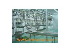 Goat to be slaughtered are relaxed first by warm shower. Then hung up, and be sent to the automatic bloodletting line. After changing the rails, they are sent to the carcass processing line, and do pre-cutting, decorticator, breast-opening, organ removing, half-cutting etc. The red and white organs taken out will be processed by the sheep synchronous hygienic inspection line, and the two halves of the split sheep will be sent to discharge the acid in the acid-discharging cabinet through the manual track.