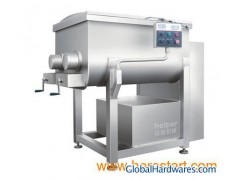 Vacuum meat mixer, mixer for meat mixing, meat blender The mixer produced by our company is developed through our own efforts combining with reference to the international advanced product features and national meat product processing technology. The vacuum devices will make the working bin in negative pressure condition, which will mix the materials evenly and inflated sufficiently. with the characteristics of no air bubble, good flexibility, bright color and the ability of extracting protein to the maximum limit, the mixer is definitely an ideal equipment to change the product quality. The whole machine is made of stainless steel, which enables the machine to have good reliability, durability, air tightness and convenience to clean. The backward open structure makes it safe and reliable. The parallel twin-axial structure and ramp type blades will make the materials at the optimum degree for various process requirements. The cycloidal gear of this machine makes transmission stable reliable, and low noise. This machine is the best of same products. MAIN PARAMETERS of meat mixer: POWER: 380V, 50Hz 2.2kw× 2+1.1kw MIXING SPEED: 42r/min BOX CAPACITY: 300L AIRPRESSURE: 0.5Mpa WEIGHT: 600Kg DIMENSION: 1190× 1010× 1447(mm)
