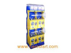 Double-Deck Toy Vending Machine (TCV-303) 1. Size: 42*31*142cm (unboxed); 45*35*145 (boxed); 2. Weight: 10.5Kgs (net) / 12Kgs (gross); 3. Color Available: Blue+Yellow, Orange+White, or customized 4. Vending Size: Adjustable for 45mm~70mm diameter toy capsules; 5. Capacity: 70PCS of 70mm capsules per canister, 140 PCS per machine; 6. Coin Adaptability: Any coins within 28mm*2.5mm, and allows 1~4 coins per vending; 7. Construction: PC canister, ABS body, mechanical coin-mech; 8. Combination: Can be combined as 4 or 6 or more heads from back by joint-plate; 9. Shipping Capacity: 120Sets/20'GP; 250Sets/40'GP; 2 heads (double-deck)/Set.