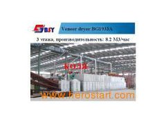 Model BG1933-A Working width (mm) 2650 2800 Working decks (layer) 3 Length of heating section (mm) 2000x13=26000 Lengtheof cooling section(mm) 2000x1 Transmission speed (m/min) 1.5-15 2-28 Drying capacity (m3/h) 5 Steam consumption (kg/h) 2800 Total motor power (kw) 163.9 Transmission motor power(kw) 16.5 Calorifier motor power (kw) 143 Cooling Fan power (kw) 4.4 Weight (kg) 88000