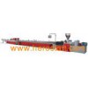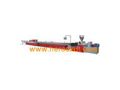 YF series PVC non-profiled material production line is mainly used in PVC door and window profiled material, wide door plate, extrusion of multi-holes pipe for passing through lines (four holes, six holes, seven holes, nine holes, etc). For different sectional surface and molds, twin parallel(conical)screws extruder of different specifications can be chosen together with corresponding vacuum calibrating table, haul-off unit, cutting unit, tilter, etc. Capacity of main frame can be optionally chosen from 60-700 kg/hour. The haul-off unit has applied unique lift technique of our company. Its work is stable, reliability is good, and pulling force is large. Vacuum setting gas applied special enlarged vortex cooling system which is good for cooling and calibrating so as to meet demand of high speed extruding. Movement speed and drawing speed of cutting machine keep synchronous. All movements are controlled by imported PLC, the design is reasonable, the operation is stable, it can conduct automatic cutting with fixed length. Power and dust section device can be provided. With different molds, the tilter platform can choose such specifications as 4-meter, 6-meter, etc. With twin parallel screws extruder, it is particularly suitable for high speed extruding of profiled material.