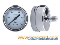 Suitable for heavy operating conditions. Resistant to vibrations and pulsating pressures when liquid filled The series main contain follow general specification. Case Sizes: 2.5", 4", 6" Pressure Range: With range from 30inHg(vacuum) through 15000psi Bourdon Tube: With SUS316 material, range from vacuum through 1000psi in C-form, soft soldered, range above 1500psi in helical, silver soldered Movement: With SUS304 stainless steel standard material Cases and Ring: With SUS304 staunless steel material, the ring which retains the window is flat bayonet threaded type, dull or polished case and ring Blow Out Disk: Fitted as standard Connection: With SUS304 stainless steel standard material, bottom mounting and backside mounting available, 1/8", 1/4", 1/2", 3/8"PT, NPT, BSP are the standard threads, available for suitable dial diameter Dials: Dials are uniformly graduated and have highly legible black markings. In single scale(psi, bar Kpa, Mpa, or kg/cm2) or dual scales as request Windows(Lens): PC, tempered glass or safety glass Liquid Filling: With or without liquid, 99.5%glycerine. Others available Pointer: With a fixed pointer or with micro adjustable Accuracy: By 1.6cl or 1.0cl Options: Many different styles and materials are offered, open gauges with and without device and solid front or back flange gauges or with U-clamp. Custom dial face, special connections, e-mail us or our distributor your logo or draw for special connection