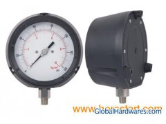 Used when the operating conditions require particular attention to safety, which is guaranteed by a protection wall and a blow-out device The series main contain follow general specification. Case Sizes: 4.5" Pressure Range: With range from 30inHg(vacuum) through 15000psi Bourdon Tube: With SUS316 material, range from vacuum through 1000psi in C-form, soft soldered, range above 1500psi in helical, silver soldered Movement: With SUS304 stainless steel standard Cases and Ring: With SUS304 staunless steel material, the ring which retains the window is bayonet threaded type, dull or polished case and ring Connection: With SUS304 stainless steel standard material, bottom mounting and backside mounting available, 1/4", 1/2"PT, NPT, BSP are the standard threads Dials: Dials are uniformly graduated and have highly legible black markings. In single scale(psi, bar Kpa, Mpa, or kg/cm2) or dual scales as request Windows(Lens): Molded plexiglass with o-ring seal, tempered glass are available Pointer: Balanced Auminum pointer with black finish(micro adjustable) Accuracy: +/-1% full scale