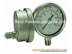 Suitable for heavy operating conditions. Resistant to vibrations and pulsating pressures when liquid filled The series main contain follow general specification. Case Sizes: 1.5", 2", 2.5", 4", 6" Pressure Range: With range from 30inHg(vacuum) through 15000psi Bourdon Tube: With SUS316 material, range from vacuum through 1000psi in C-form, soft soldered, range above 1500psi in helical, silver soldered Movement: With SUS304 stainless steel standard material Cases and Ring: With SUS304 staunless steel material, the ring which retains the window is bayonet threaded type, dull or polished case and ring Liquid Filling: With or without liquid, 99.5%glycerine. Others available Connection: With SUS304 stainless steel standard material, bottom mounting and backside mounting available, 1/8", 1/4", 1/2", 3/8"PT, NPT, BSP are the standard threads, available for suitable dial diameter Dials: Dials are uniformly graduated and have highly legible black markings. In single scale(psi, bar Kpa, Mpa, or kg/cm2) or dual scales as request Windows(Lens): PC, tempered glass or safety glass Pointer: With a fixed pointer or with micro adjustable Accuracy: Standard by ASME B40.1 Options: Many different styles and materials are offered, open gauges with and without device and solid front or back flange gauges or with U-clamp. Custom dial face, special connections, e-mail us or our distributor your logo or draw for special connection