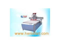 CNC Router (R-1325D) Applications; Cut and Engrave for: Synthetic glass materials: Acryl, Light guide, diffusion board etc., Thermoplastic materials: PVC, ABS, PF, PE, PU; Compound materials: Fiber glass, Rostone, Compact grade laminate, Insulation materials, bakelite; Wood materials: Solid wood, MDF, Flakeboard; Light metal materials: Aluminium profile, Copperplate. Features; 1. Cast steel body with aging treatment, solid and durable; 2. Air patenting spindle, Imported ceramic bearing, with good thermal protection function, the machine will stop automatically when the temperature is more than 80, durable and powerful; 3. Taiwan AMT/STF25MM linear slide, high precision, heavy load and durable; 4. Leisai driving system, step working mode with very good resolution and nicely orientation; 5. DSP control system with USB port, can be running without PC; 6. Transmission device: X, Y spindle are both high precision rack transmission, Z spindle is ATM screw transmission from Taiwan; 7. Electric appliances and motor control protection are matching to European Union IP54 standards; 8. Use special belt handle cable, which has function of Anti interference, Anti static, high flexibility, will not broke after long time use; 9. Vacuum adsorbed worktable: Adapt European design standard, dividing worktable into 4 adsorbed areas, 32 adsorbed holes in each, which insures the adsorbability to be equal; 10. Support TYPE3, CAXA, MASTERCAM, ARTCAM, UG etc. Software. 11. Two blades, quickly automatically switch.