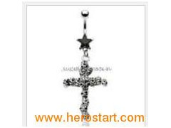 This solid dangling belly bar features a cross that has been fully engraved with skulls. A cleverly crafted peice that is set off with a 7mm black prong set star at the base of the belly bar. The solid cross measures 30mm in height, 22mm in width and dangles freely from two chain links. You won't be disappointed. Navel Ring Specifics Standard 14 Gauge 3/8" (10mm) Belly Bar 316L Surgical Stainless Steel Jet Black Cubic Zirconia Gem