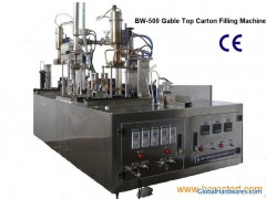 BW-500 type gable top carton filling machine is semi-automatic, including the following parts: Carton forming part, capping part, top performing part, filling part, top sealing part, and date printing part. The entire machine is made of food-grade stainless steel, and the surface is special processed to be beautiful and durable in use.1. Work flow:1) Carton Forming part: Put the cardboard onto the mandrel (manually) -- Bottom performing -- Bottom heating -- Bottom sealing2) Capping part: Put the cap into and the carton's capping hole (manually) -- Ultrasonic welding -- Top Open Carton with Cap3) Top performing part: Top preforming4) Filling part: Put the carton to the filling part (manually) -- Rationing filling -- Filled Top Open Carton with Cap5) Top sealing part: Top heating -- Top sealing6) Date printing part: Date printing -- Finished Product2. Suitable for filling:Milk, yogurt, cream, beaten egg, soy milk, juice, tea drink, corn drink, pure water, sauce, wine, spices, cleaning solution, chemical product, sugar, grain, cornmeal, other dry powder, etc.3. Technical parameter:1. Capacity: 250--1000ml (can be filled by one machine)2. Output: 400-500 cartons/hour3. Packing material: Cardboard carton / aluminium foil carton4. Filling temperature: Cold filling: 2-50 degC / hot filling 88-92 degC5. Cap: With cap (Optional)6. Overall power: 15KW (three phases of electricity)7. Size: (L*W*H): 1.6m*1.2m*1.8m8. Compressed air pressure: 0.8-1.0 Mpa, Flow rate: ≥ 0.4M3/min, without oil, water and dust9. Cooling water: Flow volume: ≥ 20L/ min Temperature: Normal temperature10. Net Weight: 500kg11. Installation requirement: Any smooth floor, such as cement, floor tile, plastic ground, etc. Do not need to make angle.