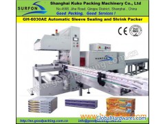 Features1)Adopts foreign advance manufacturing technology and unique appearance;2)According to your demand, you could choose line feeder or a 90 ° angle conveyor;3)The machine can automatically stack the production requirements of 5 layers, 4 layers, 3 layers, 2 layers or several rows and doesn’t need another mould;6)Adopts Mitsubishi "PLC" Program to achieve mechanical, electrical, pneumatic all-in-one;7)Use specially designed sealing blade, and sealing line is stable, no cracking, and not easy to stick knives;8)Use imported photoelectric to ensure accurate position;9)Use imported double wind blowing motor, so that hot air in oven could be spread evenly, shrink perfectly. SpecificationModel GH-6030AESF-6040EPower Supply220V 50Hz 1phase220V 60Hz 3phase 2kw380V 50Hz 3phase220V 60Hz 3phase 18kwHeight & Length of In-feed Conveyor850±50/1500mmTunnel Size(L x W x H)1800x600x400mmShrink FilmPE POF PVCPE POF PVCMax. Packing Size L≤450mmPacking Speed8-12 packs/min4000~6000pcs/hourMachine Size(L x W x H)1360x2120 x1900mm2800x1000x1680mmPackaging Size(L x W x H)1410 x2170x2050mm2850x1050x1830mmNet/Gross Weight500kgs/550kgs580kgs/630kgsConfigurationSealing Part Item NameBrandRemarksPhotocellOmronFrom JapanSolid RelayKudomFrom U.KCylinderAirtacFrom TaiwanSolenoid Valve AirtacFrom TaiwanReducing MotorGPGFrom TaiwanFilm MotorLiang chiFrom TaiwanPLCFatekFrom TaiwanTouch ScreenUniConFrom TaiwanIntermediate RelaySiemensFrom GermanyContactorDelixiFrom ChinaHeating ElementsHomemadeStainless steelAll SwitchesSiemensFrom GermanyCutterHomemadeFrom ChinaShrink Tunnel Item NameBrandRemarksSolid RelayKudomFrom U.KReducing MotorGPGFrom TaiwanRecycling MotorBolongFrom ShanghaiTemperature ControllerAutonicsFrom KoreaFrequency InverterSchneiderFrom FranceAll SwitchesSiemensFrom GermanyInsulationAluminum Silicate5cm thicknessIntermediate RelaySiemensFrom GermanyThermal Overload RelayDelixiFrom ChinaAC ContactorDelixiFrom China