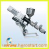 Plastic mini extruder 1. This unit is mainly used in extruding soft and hard PVC, PE and other thermoplastic plastics. It can process all kinds of plastic products with auxiliary machines concerned, such as film, pipe, bar, plate, thread, ribbon, insulating layer of cable, hollow products and so on. It is also used in graining. 2. This machine's design is advanced. Its capacity is high. Its plasticization is good, and its energy consumption is low. It adopts hard tooth face of gear for transmission. It has advantages of low noise, smooth operation, large loading, and long use-lift and so on.Items Technical Parameters 1. SJ 45/30 Single Screw Extruder Supplier of electric control cabinet Main transducer and feeder’s transducer:ABB/Hitach Output capacity 45-50kg/h Power supply 380V,3P,50Hz Inlet wire terminal of power resource Three-phase four-wire system Manufacture of the motors, pumps The main AC motor:18.5KW. AC inverter (Japanese Yaskawa). Forced air ventilation With Type of Temperature control curve Temperature fluctuating self-adjusting (PID Type) Origin places of the temperature control meters, manometers, and speedometers RKC (Japan) temperature control system, Xiaogan Wuyue (China) sensors, and high quality speedometers respectively. Pressure Display Without melt pressure display Connection of die head with flange By bolts The display method of data in operating panel Mainly digital display The advantages over other companies in this field Good shearing, high output, reasonable design, high accuracy and easy control. High-grade materials and parts with steadfast performance. 2. Screw Diameter (mm) 45mm L/D ratio 30:1 Screw speed: 120rpm Quantity 1 pieces Thickness of nitrided layer 0.6~0.7 mm Suitable for powder material or not Yes Material of screw 38CrMoALA Construction type Newest and high-efficiency type 3. Barrel Barrel type Integer Heating method Air cooling unit, special stainless cover and red copper electricity heater are used on the barrel Heating zones Four zones Heating power 2.2Kw Temperature range 50~300 Cooling zones Four zones Cooling system 4X0.25Kw Blower fans Cooling medium Air Manufacture of the barrel and screw Zhangjiagang Longree Machinery Co., Ltd(Top brand in China) Quality Guarantee Testing block and tested report are available. Guaranteed period is more than 10000 working hours Thickness of nitrided layer 0.6~0.7mm 4. Driving system and speed reducing system The power of main driving motor 18.5Kw Working method of the main motor AC governor motor The rotation speed of the main motor 1480r/min The type of gearbox 375#, Helical gears, hardened Gears Carburized and ground; The material is 20CrMoTi Speed-adjusting method of the main motor European AC governor