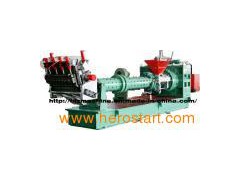 Usage: pin-barrel cold feeding rubber extruder is mainly used for the extrusion of various of rubber profile and rubber materials feeding for other machines. features: 1.pin-barrel cold feeding rubber extruder is equipped with different extrusion heads to be applied to extrude various half-finished rubber products and also to used to feeding rubber materials for calender. 2.the barrel is composed of several zones, in the feeding zone, the spiral slots work with the side rolls to enchance feeding capability. in the plastication and extrusion zones, different numbers of pins are fitted. the barrel is of the dual metal structure and bored circumferentially. 3.the screw is nitrogened treatment , makes it more wear-resistant. 4.the gears in the reducer are made of alloyed steel which teeth are hard. 5.a hot water circulation device automatically controls temperature in each zone. 6. the pin-barrel cold feeding extruder is drived by D.C motor.