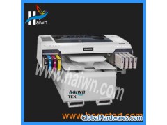 (1)PerformanceMax can be printed 420 mmx600mm8 large capacity (110 ml/box) independent cartridges. Convenient Replacement maintenance(CMYK+WWWW)continuous printing or a continuous interval printingsatisfy large quantities of industrial demand equipped with professional one set T-shirt printing mode, print more simplystandby energy saving mode(2)SpecificationsPrint modelHaiwn-T600Print sizeMax 420mmX600mmSpecifications950×850×570 mm(W*L*H)Printing MethodInk-jet (Micro Piezo Head)Net weight113KgGross weight165kgPrint speedup to 50 light shirt/hr or up to 15 dark shirt/hrPrint head cleaning methodautomaticTransmission modeUSB2.0Print resolution2880*1440dpSoftwareRip softwarpMaterial usedCotton, polyester, silk...inkWater textile pigments: C, M, Y, K, 4 WhitesSupply inkbig capacity ink cartridgePowerAC220V/110VDriverWin XP/Vista/7Operating environmentTemperature:10-35degree,Humidity:20-80%PackingWooden case(3)Characteristics Haiwn-T600 is direct to garment inkjet printer. It prints directly with amazing speed up to 50 light shirts or 15 dark shirts per hour, it can print also on: light and dark colored textiles like: t-shirts, towels, jeans, aprons, bags or else, with superb adhesion of ink. You can print beautiful full-color prints on any fabric faster and cheaper than on any other printer, or with other technologies like: thermo transfer or screen printing. It is very easy to use and has a high profit return. White Ink Haiwn's water-based white ink was specially developed for printing on dark garments by creating a solid surface on the printing area before applying the CMYK inks. This white layer is digitally applied directly onto the desired location on the garment, allowing to immediately applying the CMYK colors, wet-on-wet.Ink SystemRevolution in direct garment printing! Haiwn-T600ink System is crucial for smooth day to day operation without losing ink or print head starvation and clogging. System is 100% vacuumed, so no oxidation and ink starvation is happening during the printing. No need for clogging filters, or expensive daily cleaning and printing unnecessary files to get the good printing conditions. Ink is consistent Always, 100% automatic!Haiwn-T600 adopts a brand-new digital printing mode that can be used as the substitute of screen printing, and transfer printing. It realizes color printing without plate making or repeated color register, while it is highly waterproof, wearing resistant. It offers higher printing quality than traditional method, simple operation and stable performance. Thus, it can completely meet batch production of large scale in various areas and improve the competitive power of products.Haiwn offers excellent service and support. With an Haiwn printer you will receive Teaching DVD, Manual, around-the-clock technical support on line and a host of other tools. Haiwn provides users with all the service, support and education needed to maintain productivity; both online and over the phone - to make the most out of an investment in an Haiwn printer.Warranty:one year. Any parts (except print head and ink pump) questions on normal use, will provide new ones within one year. Beyond one year, only charge at cost.