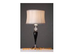 26.5"h glass table lamp base, elegant lady style. Black glass finish with chrome base. Barrel shade in silver silk fabric, Size in 11*12*9"h, double fold black and self trim on top and bottom, clear cord, 3-way 100W