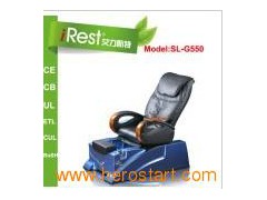 Pedicure SPA Massage Chair (SL-G550) Function: 1. Designed with a set of vertically movable, four-wheel driven muted massage hands. 2. Programmed with five emulational massage methods of shiatsu, kneading, flapping, knocking and synchronous kneading & flapping. 3. Automatic massage for the upper body. (There are three optional modes for the shoulder and neck, the upper body, the back and waist). 4. Manual massage for the upper body with three options, namely overall, partial and fixed massages, with five levels of speed adjustable respectively. In the state of fixed massage, the massage hands can move up and down; In the state of flapping, shiatsu and knocking, the width between the two kneading balls is adjustable with three levels: Wide, Medium and Narrow. 5. Seat cushion air-pressure massage: There are four built-in airbags with three air-pressure massage modes and two intensity options. 6. Backrest can be electrically reclined & declined. 7. Stretch the seat horizontally back and forth for 120 mm. 8. Three timing levels, namely 10', 20' and 30'. 9. Reverse the armrest back by 90° .