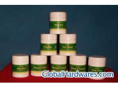 NATURAL HERBAL COSMETICS - SKIN CARE PRODUCTS. Our Herbal Skin Care products contains only a unique blend of 100% Natural herbal extract ingredients and the following products which are suitable for all. 1) ALMOND CREAM FACIAL - Anti -Wrinkle Care Almond oil is a rich source of vitamin A, E and F, which are required for a healthy skin and forms soft tender, rejuvenated skin. Retards ageing of skin. 40Gms pack. (Ingredients : Each gram contains : Badam taila 57%, Madhujam 2.5%, water herbal extracts and perfume - qs) 2) ALMOND CREAM - Under Eye Cream Almond oil is a rich natural source of vitamin A, E, and F which are essential for formation of soft, tender skin, for removing puffing under the eyes. 40gms pack. (Ingredients:Each gram contains : Badam taila 0.57gm, Madhujam 0.25gm, Tankanakshara, water and perfume - qs) 3) ALMOND CREAM – All Purpose All purpose facial cream prepared from almond oil and floral extracts. Nourishes the skin and keeps its lustrous and healthy. 40Gms pack. (Ingredients : Each gram contains : Badam taila 50%, Madhujam 25%, ) 4) ALMOLIVE – Massage Cream Nourishes and brightens the skin. 40Gms pack. (Ingredients : Each gram contains : Badam taila 0.3gm, Olive oil 0.2gm and prepared with herbal extracts and water) 5) FOOT CARE - Ayurvedic Foot Cream An effective herbal cream for fissures and cracks on feet - closes the cracks and accelerates in rejuvenating the new skin. 40Gms pack. (Ingredients : Each gram contains : Equal parts of Turmeric, Ficus bangalensis, Calotropis gigantea and other natural ingredients in a suitable cream form) 6) HARIDRA - Sandalwood Oil & Turmeric Cream Natural antiseptic and keeps skin lustrous and healthy. 40Gms pack. (Ingredients : Each gram contains : Haridra extract 0.050gm, Kala-meshika extract 0.050gm,Karpuram 0.050gm, Chandana taila 0.015gm, Tankanakshara 0.010gm, cream base -qs) 7) PIMPLEX - For Pimples & Acne Removes acne and clears blemishes and softens skin. 40Gms pack. (Ingredients : Each gram contains : Pterocarpus santalinus 20%, Camphor 10% Glycyrrhiza glabra 10%, Moong flour 20%, cream base - qs) 8) SUNSOOTH – Sun Protection Cream Protects the skin from UVC and UVB rays. Made from vegetable extracts. 40Gms pack. Ingredients : Each gram contains : Tila taila 2.80gm, Madhujam 1.20gm, water 0.30gm Tankanakshara 0.65gm, other Herbal extracts 0.05gm). All the above products are developed in the in-house R & D Laboratory and harmonious blend of traditional 100% natural ingredients with modern technology and internationally recognized ailments. Packing details : All the products are packed in pure white plastic containers and then containers are laminated by transparent polythene paper.