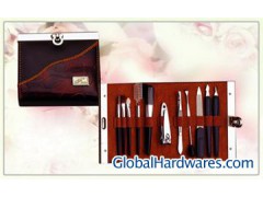 7pcs stylish manicure set. description:Manicure Kit/Manicure Nail Tool/Manicure Tweezers/Brush,7pcs manicure tools in a PVC/PU case with metal frame.client's design and logo is welcomed. Material: stainless steel, Plated chrome&Plastic,PVC/PU case; packing detail:polybag and white box, 120SET/CTN 55*23*37.5CM G.W/N.W:17.5/16KGS