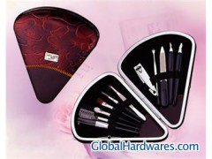 11pcs elegance manicure set. description:Manicure Kit/Manicure Nail Tool/Manicure Tweezers,11pcs manicure tools in a PVC/PU case with metal frame.client's design and logo is welcomed. Material: stainless steel, Plated chrome&Plastic,PVC/PU case; packing detail:polybag and white box, 96SET/CTN 55*35*33CM G.W/N.W:16/14KGS
