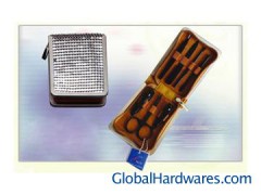 7pcs flowery manicure set. description:Manicure Kit/Manicure Nail Tool/Manicure Tweezers,7pcs manicure tools in a PVC/PU case with metal frame.client's design and logo is welcomed. Material: stainless steel, Plated chrome&Plastic,PVC/PU case; packing detail:polybag and white box, 96SET/CTN 41.5*38*26CM G.W/N.W:20.5/19KGS