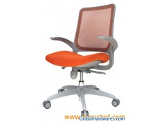 Materials: 1. Backrest: Grey frame with orange mesh. 2. Seat: High elastic foam wiht orange fabric cover. 3. Base: Grey nylon star base. 4. Castor: Grey nylon castors 5. Armrest: Grey plastic. Functions: 1. Mechanism: Manual-control, multi-angle tilt lock. 2. Seat height: Adjustable(up & down) 3. Backrest tension: Backrest can be adjusted to user's ideal tension.