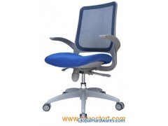Materials: 1. Backrest: Grey frame with blue mesh. 2. Seat: High elastic foam wiht blue fabric cover. 3. Base: Grey nylon star base. 4. Castor: Grey nylon castors 5. Armrest: Grey plastic. Functions: 1. Mechanism: Manual-control, multi-angle tilt lock. 2. Seat height: Adjustable(up & down) 3. Backrest tension: Backrest can be adjusted to user's ideal tension.
