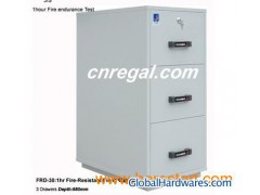 FRD680-30:1hr Fire-Resistant Filing Cabinet 3 Drawers. Outside size: (H)1231*(W)551*(D)680mm (H)48.46''*(W)21.69''*(D)26.77'' Packing size: (H)1350*(W)560*(D)730mm (H)53.15''*(W)22.05''*(D)28.74'' Inner file drawer size:(H)294*(W)388*(D)492mm (H)11.57''*(W)15.28''*(D)19.37'' Net weight: 245kg(539lbs) Gross weight:259kg(Carton box with plywood pallet)/570lbs Wheels on the base. Passed the Japanese "JIS-S 1037-1989 " Standard 60-minute fire test, the temperature inside the Paper Drawer is controlled under 115.5 Centigrade degree under 1000 degree. (Report No.: 2003-0567) Surface finished with powder coating. Steel thickness of fireproof cabinet : Body 50mm / Front Drawer 72 mm Wheels on the base.