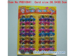 Desction: LOVELY GLASSES Item No: PHD10641 Packing : Packed Blister card carton meas:92*32*82cm qty/ctn: 96pcs g.w/ctn:29kgs n.w/ctn:27kgs