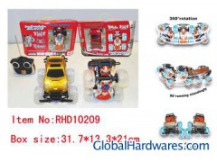 Item No:RHD10209 Name:STUNT RACING CAR WITH ROBOT,MUSIC AND LIGHT Size:19*17.5*11cm Window box size:31.7*13.3*21cm Packing:in portable window box carton meas:81*32*84CM qty/ctn: 24PCS g.w/ctn:20KGS n.w/ctn:18KGS Funtion:five channel,forward,backward,left/right 360°spins,standing from left /right 360°,spins 3 kinds of music(change the music by press) the programming auto-demo(to follow the music rhythm auto show),mute option . Notes:Controller required:1*9V Battery(include) The stunt car required :3*AA batteries(include) Remote distance :greater or equal10 meters Frequency:27MHZ/40MHZ