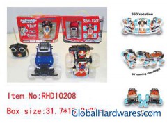 Item No:RHD10208 Name:STUNT JEEP WITH ROBOT,MUSIC AND LIGHT Size:19*17.5*12.5cm Window box size:31.7*13.3*21cm Packing:in portable window box carton meas:81*32*84CM qty/ctn: 24PCS g.w/ctn:20KGS n.w/ctn:18KGS Funtion:five channel,forward,backward,left/right 360°spins,standing from left /right 360°,spins 3 kinds of music(change the music by press) the programming auto-demo(to follow the music rhythm auto show),mute option . Notes:Controller required:1*9V Battery(include) The stunt car required :3*AA batteries(include) Remote distance :greater or equal10 meters Frequency:27MHZ/40MHZ