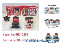 Item No:RHD10207 Name:STUNT JEEP WITH ROBOT,MUSIC AND LIGHT Size:19*17.5*14cm Window box size:31.7*13.3*21cm Packing:in portable window box carton meas:81*32*84CM qty/ctn: 24PCS g.w/ctn:20KGS n.w/ctn:18KGS Funtion:five channel,forward,backward,left/right 360°spins,standing from left /right 360°,spins 3 kinds of music(change the music by press) the programming auto-demo(to follow the music rhythm auto show),mute option . Notes:Controller required:1*9V Battery(include) The stunt car required :3*AA batteries(include) Remote distance :greater or equal10 meters Frequency:27MHZ/40MHZ