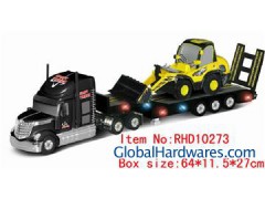 Desction: 1:32 RC heavy truck with construction car Item No:RHD10273 Size:65*9*14.5cm Packing : Packed Window box carton meas:66*48*82cm qty/ctn:12 pcs g.w/ctn:21kgs n.w/ctn:19kgs Function: For the trailer: 1). remote control; 2). forward, backward, turn left, turn right; 3). auto load and offload the trailer; 4). the chassis with 4 colorful lights; 5). with 2 pcs head lights and turning lights; 6). the both sides of the trailer with 10 colorful lights; 7). with sounds of start, move, backward, stop. For the car: 1). remote control; 2). forward, backward, turn left, turn right; 3). the arm could be work like a real car; 4). with 2 pcs head ligths and 2 pcs two tail lights; Batteries: TRUCK: 6 x 1.5V AA CAR: 4 x 1.5 AAA CONTROLLER: 2 x 9V (ALL NOT INCLUDED)