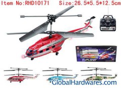 tem No.: RHD10171 Name of Product: 3 channel lightning r/c helicopter Package: Window box Quantity(PCS/CARTON): 18PCS Specification of Window box : 48*10.5*19 Product size/CM: 26.5*5.5*12.5 Outer carton/CM: 69*50*61 G.W(kg): 20 N.W(kg): 17 Certificate: EN71 EN62115 RTTE MB Description: 1、Intelligence control system;2、accelerating system;3、stable suspending system;4、economizing electricity system;5、 battery-protecting system Memo: Weight of the helicopter:about 106g;battery of the helicopter:3.7v 500mah lithium battery;battery of the remote:8*1.5v "AA"(not included);flying time:6 minutes;controllable distance:20-30m
