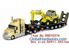 Desction: 1:32 RC heavy truck with construction car Item No:RHD10274 Size:65*9*14.5cm Packing : Packed Window box carton meas:66*48*82cm qty/ctn:12 pcs g.w/ctn:21kgs n.w/ctn:19kgs Function: For the trailer: 1). remote control; 2). forward, backward, turn left, turn right; 3). auto load and offload the trailer; 4). the chassis with 4 colorful lights; 5). with 2 pcs head lights and turning lights; 6). the both sides of the trailer with 10 colorful lights; 7). with sounds of start, move, backward, stop. For the car: 1). remote control; 2). forward, backward, turn left, turn right; 3). the arm could be work like a real car; 4). with 2 pcs head ligths and 2 pcs two tail lights; Batteries: TRUCK: 6 x 1.5V AA CAR: 4 x 1.5 AAA CONTROLLER: 2 x 9V (ALL NOT INCLUDED)