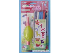 Shin Dorn TB006 balloons set include 20pcs high quality 260"atex long balloons+ 10pcs 3" circle balloon+ one piece hand pump, several eye stickers, one booklet for learning models. It can been seen present for kids, educational toy, mould toy. It has as following features: a)Kids can make several moulds (such as dog, cat, giraffe, fish, sun flower, fruits, car) by consult reference booklet. b)Pass CE certificate. c)Hand pump is made by ABS material with excellent quality, no oil leak out, Shin Dorn can promise you could repeatedly use in two years. d)Latex balloon with excellent elasticity and it is hard to break out when blowing. e)Accept OEM and put logo on card. f)Package: 12cards/innerbox/465x245x140mm, 144cards/master carton/940x440x510mm. G.W.12.7kgs
