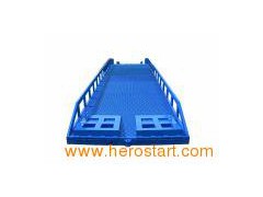 1. The machine has been tested and debugged, and all the parameters has been reached on the designed requirements. The hydaulic system does not need adjusting. 2. Yard ramp's hydraulic system and tyres should be examined carefully before the working to make sure that without the leak of oil and the weak pressure of tyres. 3. The yard ramp should be landed onto the hard ground and to fasten the fixing chains to the truck. 4. The yard ramp should be operated without load for 1-3time, and then to do loaded work. Hydraulic system: 1. With handle pump, screw the return valve clockwise. 2. Move the handle stick, to lift the ramp slowly. 3. When the return valve is screwed counterclockwise, the hydraulic oil will go back, and the ramp will fall down on its own weight. Operation: 1. Fasten the return Valve and press the handl to move the ramp over the truck soleplate. Unfold the landing legs to working height. 2. Drive the car under the plate. 3. Release the return valve, and the ramp will fall down onto the afterbody of the truck, then fasten the ramp and the truck with the chain. The hyraulic system and the tyres of ramp do not carry the weight. 4. Operating starts. 5. When the operation finishes, untie the fixing chains. Lifting the ramp by the handle stick, and then drive out the truck. 6. Uplifting the afterbody of the ramp to move around hang on the truck. Safe operation: 1. While the ramp is under using, the table should be kept in level and be stable. Move speed: 3km/h 2. While the ramp falls down, the person climbing is forbidden. 3. Overloading is forbidden. 4. Keeping the hydraulic oil clean, without the mixture of water or other impurity. The oil changing is normally half year. The model of oil is N32# in winter, and N46# in summer. 5. When the emergency occurs, the operation must be stopped immediately to repair troubles. Note: The tyre of yard ramp is only used to move the machine, after you land the legs, let out the hydraulic oil of the cylinders, or the heavy loading will break the cylinders and the tyres. For the tyre and cylinders of ramp don't carry the load. The tyre is for move, and the cylinder is used for change the working height.