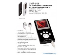 | Detailed Product DescriptionMfr Part Number: MP3/4-1GBK Color: Black Memory Capacity:1 GB Interface: USB 2.0 Display: MEGA Screen (262K Color OLED,128x128 Pixels) Music Format: MP3/WMA Recrding: Line-in Real Time Mic/Voice Recording (ADPCM Type); Built-in FM/FM Tuner Recording Lyrics Supporting Language: English/Chinese/Spanish/Portuguese/Korean/German Battery: Rechargeable LITHIUM Battery Operating System: Windows 98/SE/ME/2000/XP/2003; Mac OS 8.6+; Linux 2.4.1+ Warranty:1 year Dimension:87 x 42 x 9 mm Weight:36g Items Included: Earphones, USB2.0 Cable, Product Manual, and Drivers. |