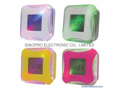 1. 4 directions display different functions of calendar, alarm, countdown and temperature; 2. 4 color back ground LED light up moodicare color changed; 3. Music alarm; 4. Temperature in C/F format;5. Powered by 2XAAA batteries, not included; 6. Unit size: 7.6X7.6X3.8cm.