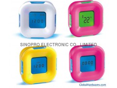 . 4 directions display different functions of calendar, alarm, countdown and temperature; 2. Blue and green back ground LED light changed; 3. Music alarm; 4. Temperature in C/F format;5. Powered by 2XAAA batteries, not included; 6. Unit size: 7.6X7.6X3.8cm