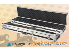 Modle number: HG-026 Name: Gun case Specification: 455*325*110mm Elucidation: Half moon aluminum frame with diamond panels EVA lining and cutting foam in the bottom Two lock with key and a silver color handle Egg shape sponge in the lid.