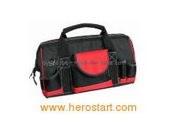18' 29 pockets Heavy Duty Tool Bag Material: Outside 1680D Polyster Inside 600D Polyster Size: 47X27X23.5 Reforced handle for Max 25kgs Adjustable should strap 1 middle pocket with slide fastener 16 small inside pockets for small tools 10 outside pockets for small tools 1 big pocket with cover for tools. 1 outside pocket with slide fastener for nails and acc.