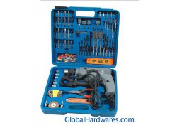 Contents:1PC 6" Long nose plier w/mat grip1PC Utility knife2PC Screw w/zinc plated2PC Wire wheel brush8PC Hex key6PC 1/4" dr. socket Size: 5-6-7-8-9-10mm1PC Fastener accessories in a clear box10PC 25mm bits Size: slotted 4-5-6mm Phillips: #0, #1, #2, #3 Pozi: #1, #2,3315PC 50mm long bits Size: slotted 4-5-6mm Phillips: #1, #2, #3 Pozi: #1, #2, #3 Torx: T10, T15, T20, T25, T30 Adaptor1PC 60mm magnetic bit holder w/black finished5PC Sanding stone3PC Wood flat drill Size: 13-16-195PC HSS Twist drill Size: 4-5-6-8-105PC Wood working drill w/black finished Size: 4-5-6-8-105PC Masonry drill w/red head zinc plated Size: 4-5-6-8-101PC 500W Impact power drill1PC 6" (150mm) torpedo level