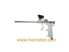Spray gun designed for the application of single component polyurethane foam, packaged in pressurized cans. The gun enables the user to adjust the product flow, thereby reducing waste. The gun is hermetically sealed, which prevents hardening of the product in the gun. The bdy has been coated with Teflon for easy cleaning. The body as well as the sealing needle has been coated with Teflon for easy cleaning and reuseable.