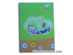 1) Size: 13 x 18cm2) Cover: 128g coated paper + 4C printed + 1.5mm cardboard3) Inner: 70g wood free paper, 1C + 1C printed, 80 sheets4) Fly sheet: 100g wood free paper5) Binding: glueInner packing: 1pc/polybag
