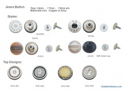 We have a wide selection of jeans buttons. New and fashionable designs in both ironand brass material, all possible sizes. Custom-made orders of your company logosare most welcomed. We offer competetive prices.