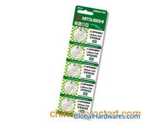 Features: 1) CR2025 button cell, lithium button cell, cell, battery, lithium button battery, lithium coin cell, 3V lithium battery 2) Brand: MITSUBISHI 3) Nominal Voltage: 3V 4) Average Weight: 2.5g 5) Nominal Capacity: 170mAh 6) Test Condition: 15KΩ load resistance, end-point voltage 2.0Volt 7) Diameter: 20mm 8) Height: 2.5mm 9) Shelf Life: 3 Years 10) Battery Applicable Products: Toy, LED light, Clock, Calculator, PDA, Memory card, etc.