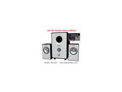 Wooden box and plastic panel, with blue-light. Beautiful sound performance. Costdown series for you.